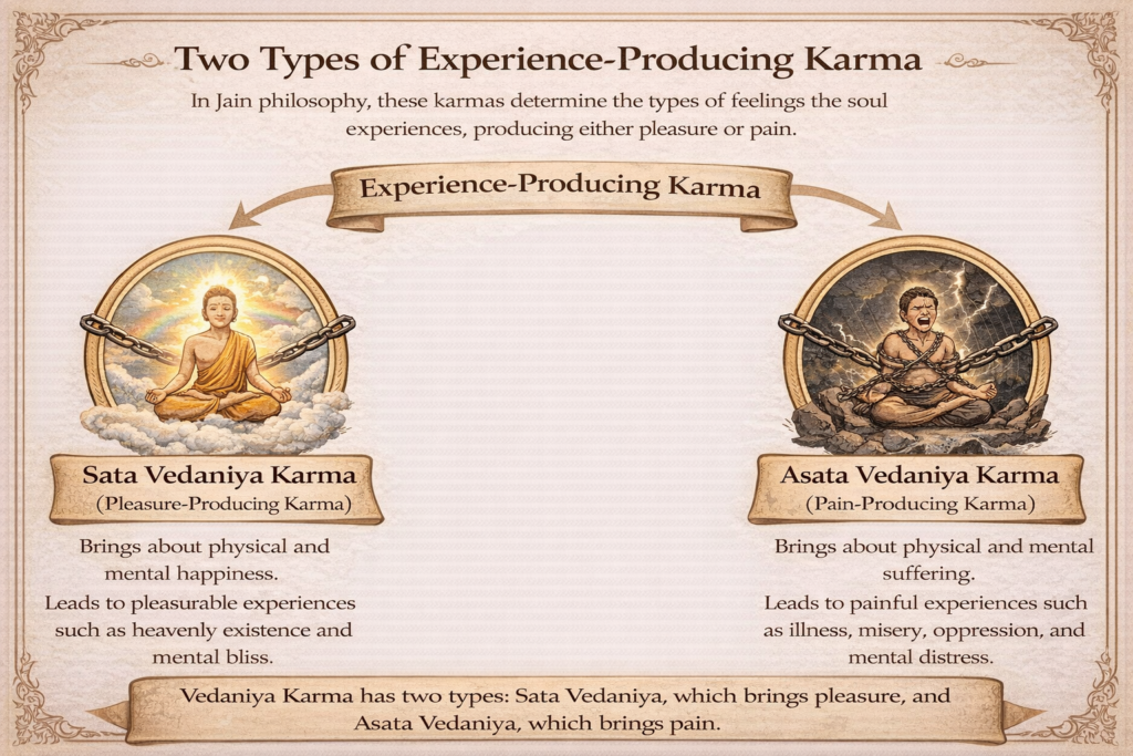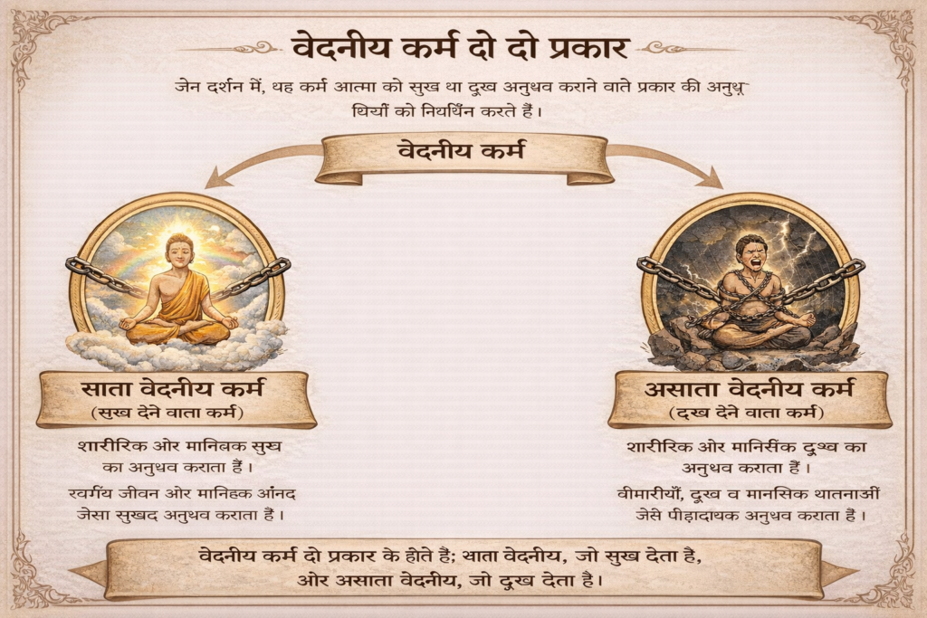 A["वेदनीय"] --> B["साता"] & C["असाता"]
