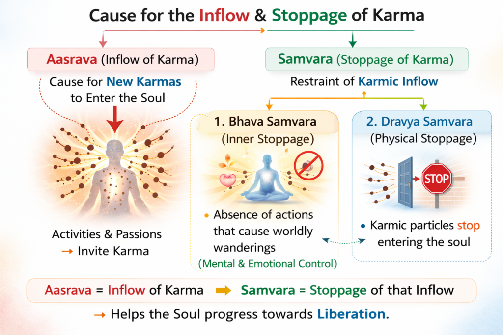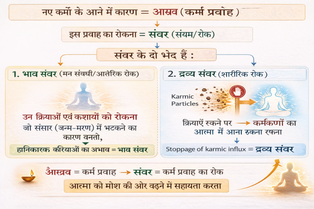 अर्थ : नए कर्मों के आने में जो कारण है उसे आस्रव कहते हैं और आस्रव के रोकने को संवर कहते हैं। संवर के दो भेद हैं-भाव संवर और द्रव्य संवर।
