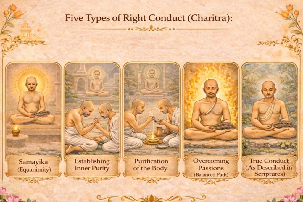 Equanimity – sāmāyika, reinitiation – chedopasthāpanā, purity of non-injury – parihāraviśuddhi, slight passion – sukṣmasāmparāya, and perfect-conduct – yathākhyāta, are the five kinds of conduct (căritra). Reference:Tatvartha-Sutra-तत्वार्थ-सूत्र-Vijay-K-Jain