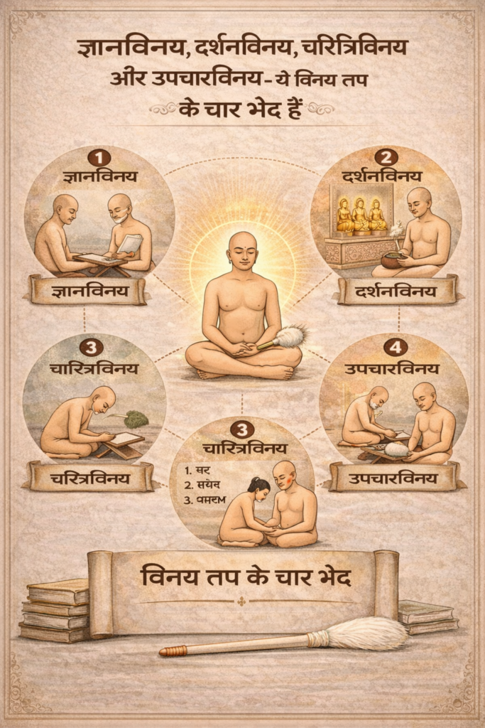 flowchart TB A["विनय"] A --> B["ज्ञान"] A --> C["दर्शन"] A --> D["चारित्र"] A --> E["उपचार"] B --> B1["ज्ञान का ग्रहण, अभ्यास, स्मरण"] C --> C1["तत्त्वार्थ श्रद्धान"] D --> D1["निर्दोष चारित्र का पालन"] E --> E1["पूज्य पुरुषों के प्रति समुचित व्यवहार"]