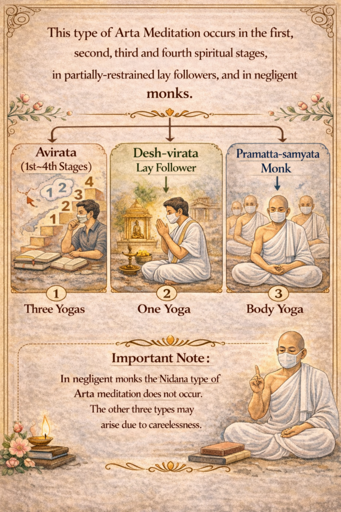 वह आर्तध्यान अविरत यानि पहले, दूसरे, तीसरे और चतुर्थ गुणस्थान वालों के, देशविरत श्रावकों के और प्रमत्तसंयत गुणस्थान वाले मुनियों के होता है। परंतु प्रमत्तसंयत गुणस्थान वाले मुनियों के निदान नहीं होता। बाकी के तीन आर्तध्यान प्रमाद के उदय से जब कभी हो जाते हैं || ३४ ॥Reference:TatvarthaSutra_KailashChand_Shastri_तत्वार्थसूत्र पंडित कैलाशचंद्र शास्त्री