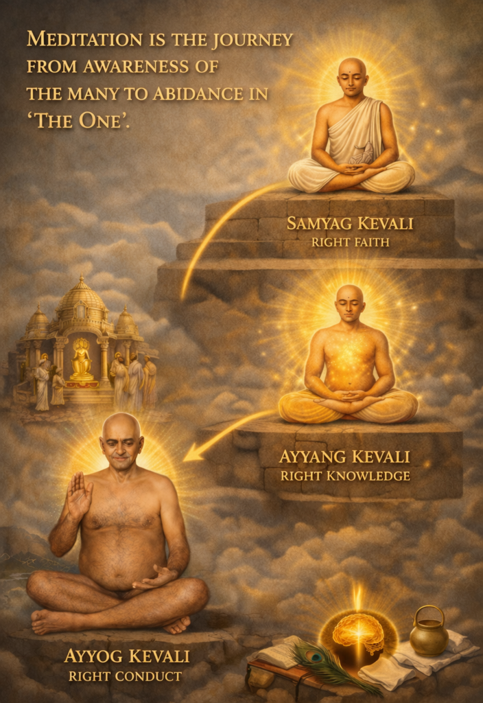 The last two types of pure meditation – śukladhyāna -arise in the Omniscient (kevalī). Reference:Tatvartha-Sutra-तत्वार्थ-सूत्र-Vijay-K-Jain