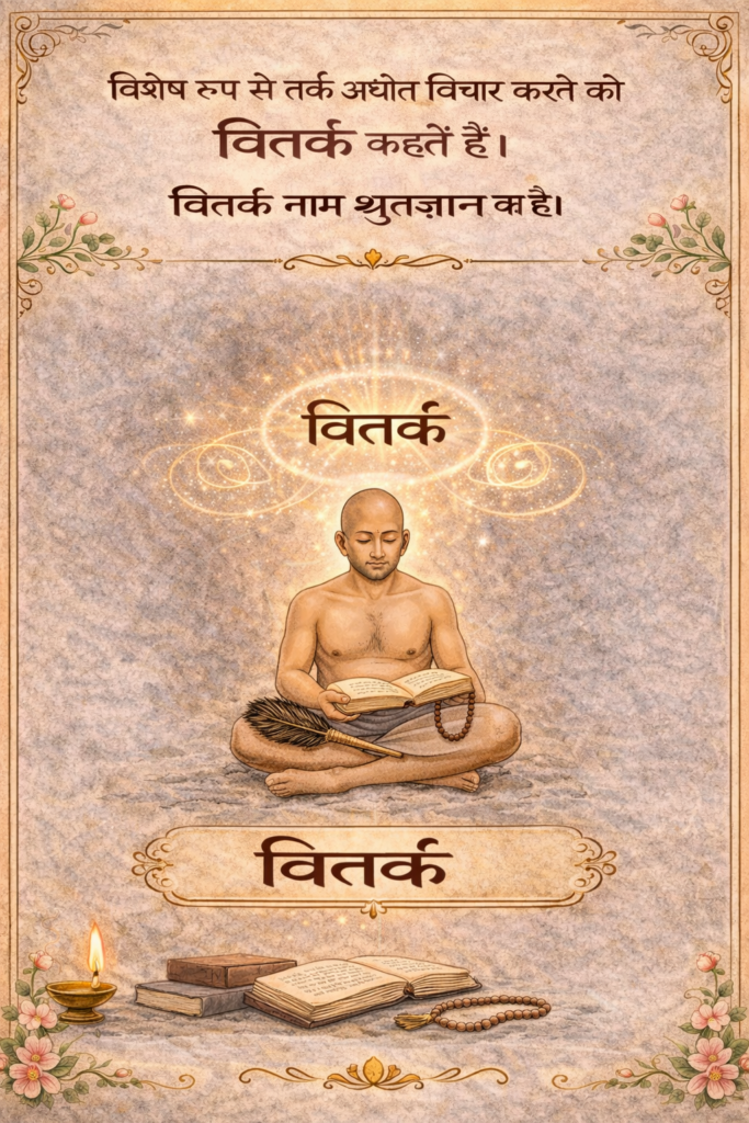 विशेष रूप से तर्क अर्थात विचार करने को वितर्क कहते हैं। वितर्क नाम श्रुतज्ञान का है ॥ ४३ ॥Reference:TatvarthaSutra_KailashChand_Shastri_तत्वार्थसूत्र पंडित कैलाशचंद्र शास्त्री