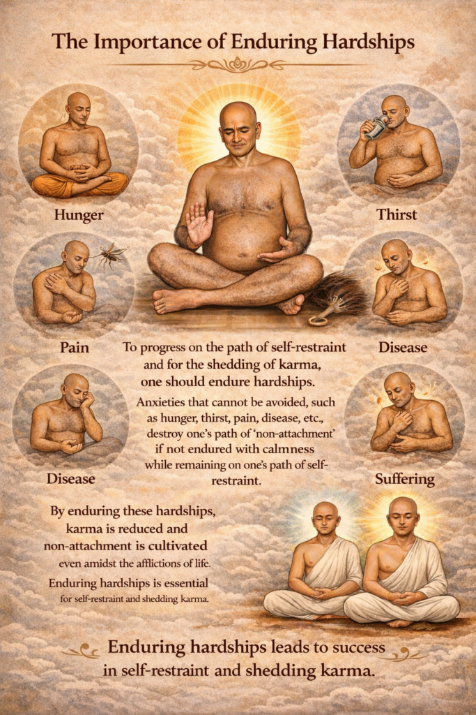 Those which are endured so as not to swerve from the path and for the sake of dissociation (nirjarā) of karmas are the afflictions (parīṣaha). Reference: Tatvartha-Sutra-तत्वार्थ-सूत्र-Vijay-K-Jain