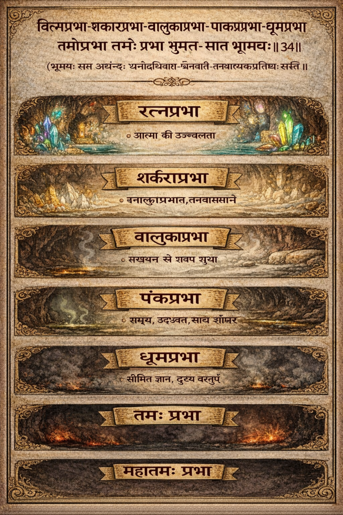 (रत्नप्रभा) रत्नप्रभा (शर्कराप्रभा) शर्कराप्रभा, (बालुकाप्रभा) बालुकाप्रभा, (पङ्कप्रभा ) पङ्कप्रभा, (धूमप्रभा) धूमप्रभा ( तमोप्रभा) तमः प्रभा और (महातम: प्रभाः) महातमः प्रभा (भूमयः) ये भूमियाँ (सप्त) सात हैं और वे क्रम से (अधोऽधः ) नीचे नीचे (घनाम्बुवाता – काशप्रतिष्ठा) घनोदधिवातवलय, घनवातवलय, तनुवातवलय, और आकाश के आधार (सन्ति) हैं।